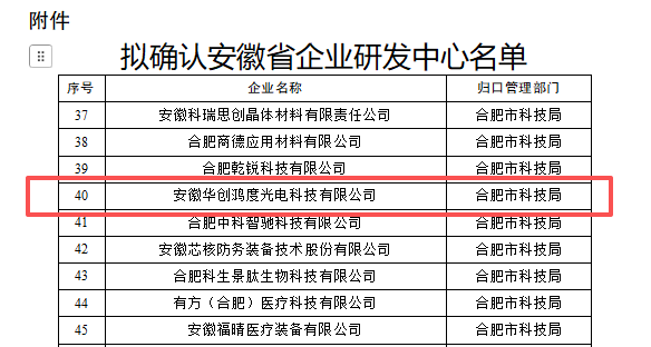 Recently,the Anhui Provincial Department of Science and Technology officially released the Notice on the Confirmation of the 2025 Anhui Provincial Enterprise R&D Centers.Anhui Huachuang Hongdu Optoelectronic Technology Co.,Ltd.(hereinafter referred to as“ Huachuang Hongdu”) has been successfully recognized as a Provincial Enterprise R&D Center,following a rigorous process that included application submission,expert recommendation, formal review,on-site inspection,and panel deliberation.This recognition reflects Huachuang Hongdu’s systematic R&D framework,advanced facilities,and sustained innovation capabilities.