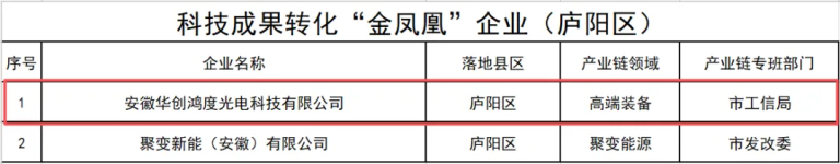 Recently,the “Golden Phoenix” enterprise for the transformation of scientific and technological achievements in Hefei was announced.Anhui Huachuang Hongdu Photoelectric Technology Co., Ltd. (hereinafter referred to as “Anhui Huachuang Hongdu”)was successfully selected by virtue of its outstanding RD strength in the field of ultra-fast solid-state lasers with high reliability and its excellent ability of transformation.