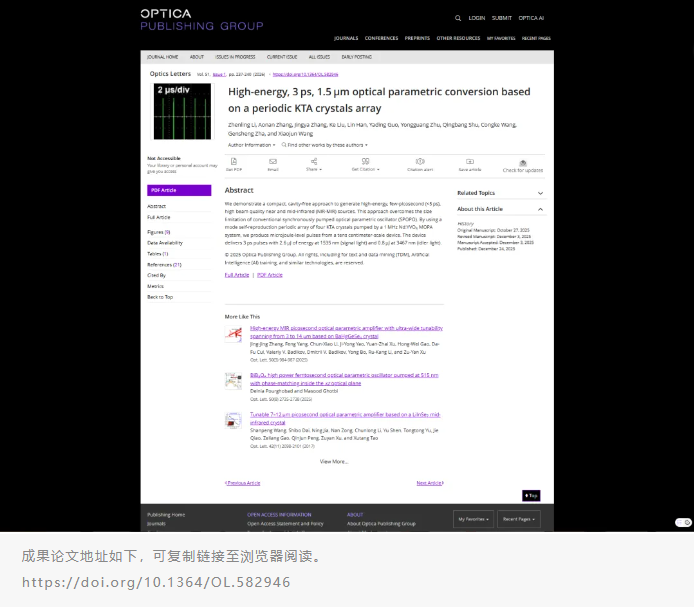 Recently,the High Energy Solid State Laser Technology Research Group of the Laser Center of the Institute of Physics and Chemistry,Chinese Academy of Sciences,has proposed and verified A New Scheme of Ultrafast Laser Parametric Frequency Conversion – Periodic Array Mode Self-Reproducing Optical Parametric Frequency Conversion Technology , the related research results are published in High-energy,3 ps,1.5 μm optical parametric conversion based on an array of periodic KTA crystalsPublished in the Optics Letters journal (volume 51, No.1.Page 237,2026).
