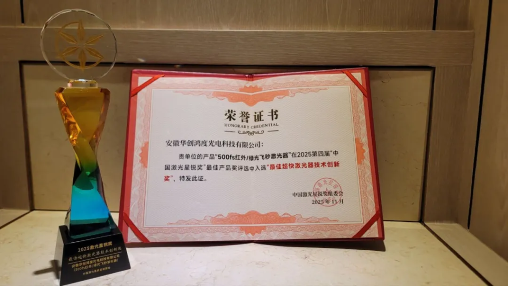 颁奖典礼上,安徽华创鸿度光电科技有限公司(简称“华创鸿度”)自主研发的50W红外飞秒激光器,荣获“最佳超快激光器技术创新奖”,赢得业界广泛关注。