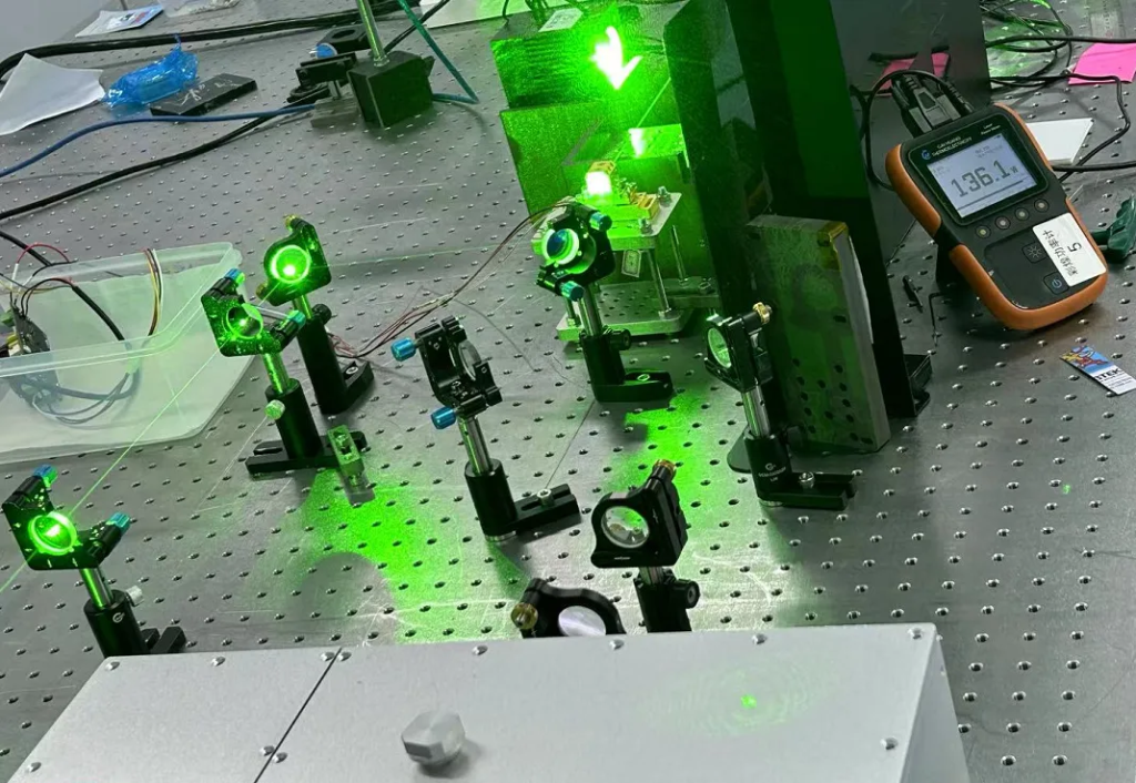 基于华创鸿度提供的激光器与理化所设计的合束光路,实验成功将两束1064nm 皮秒激光倍频后合成为一束532nm激光。