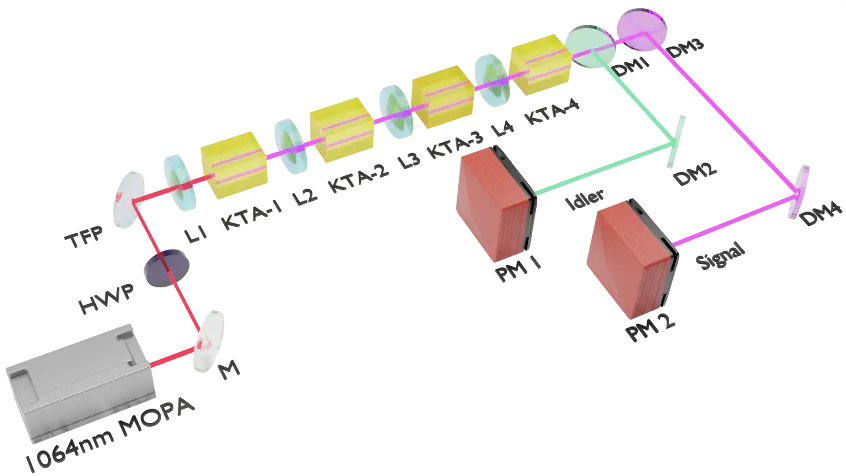 其工作原理可概括为:泵浦光与产生的信号光在这一系列晶体中多次穿行。通过精确的光学设计,信号光在每次通过晶体后都能实现 “模式自再现” ,并始终保持与泵浦光的最佳耦合状态。这一过程巧妙地在数十厘米的短距离内,模拟了数米长谐振腔的模式筛选和能量放大功能,但摆脱了SPOPO对腔长的限制。实现了“自同步泵浦”的高效变频。